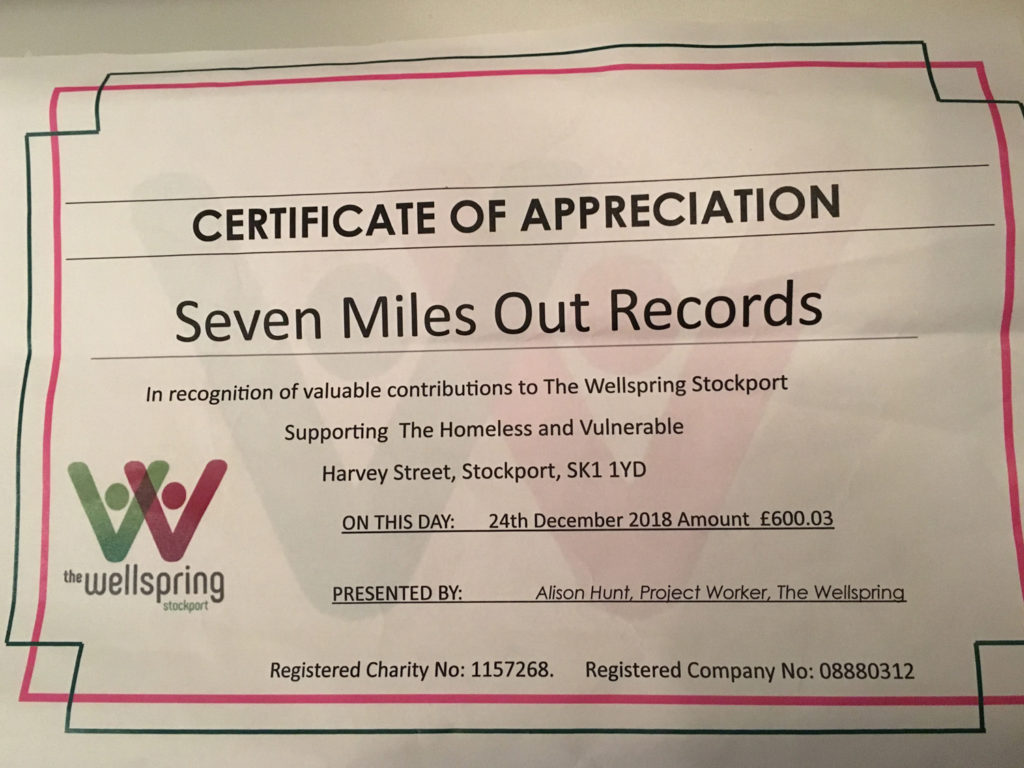Our collection for The Wellspring at Christmas Foodie Friday raised £240 on the night brought the fundraising total for Seven Miles Out Records to £600.03 – that’s 120 hot dinners for the homeless and disadvantaged over Christmas.